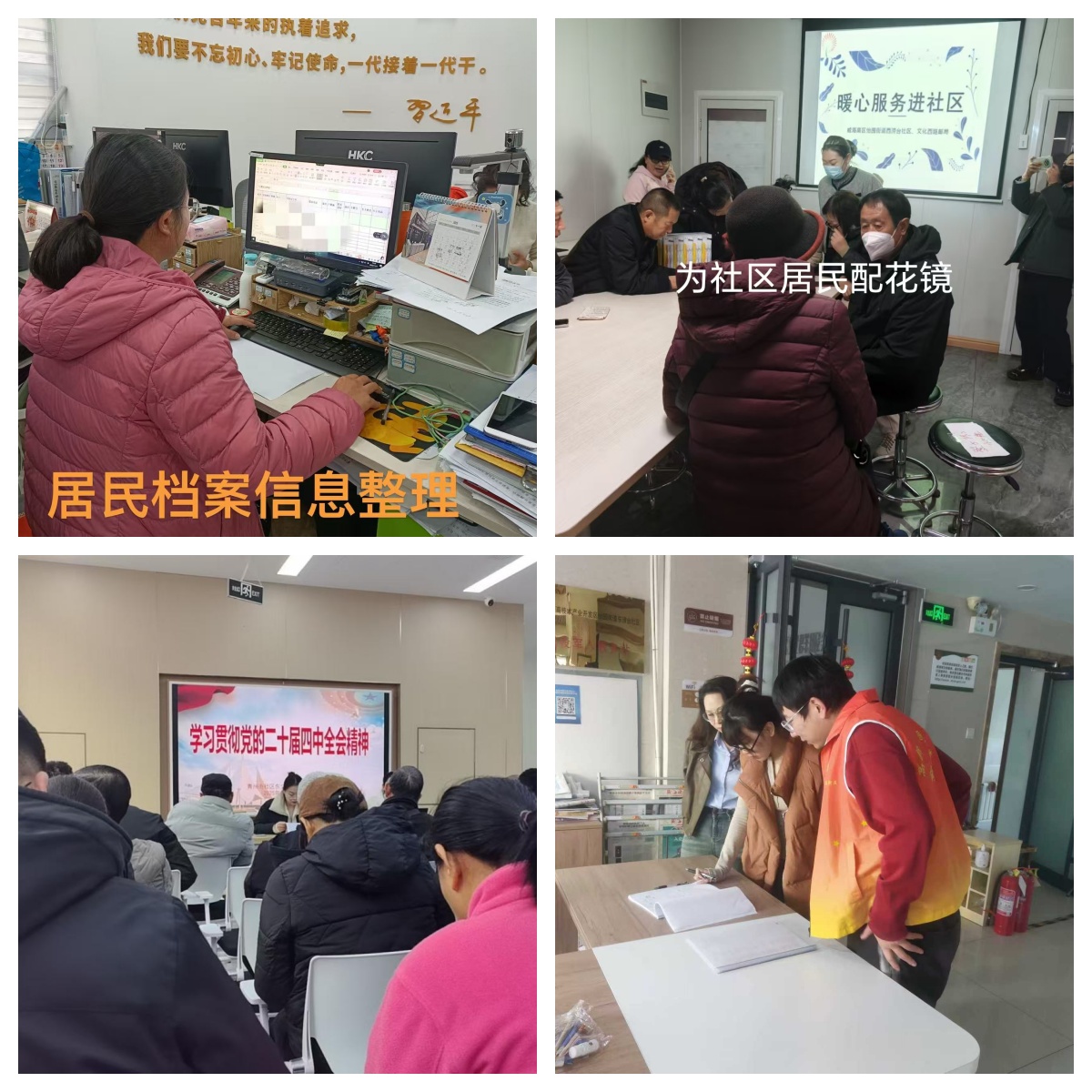 興業社區公益崗人員正在進行居民檔案信息整理,西澇臺社區協助社區居民配花鏡,青州街社區組織黨員學習,東澇臺社區協助網格員進行入戶登記居民信息。通過此次檢查,以上社區公益崗人員簽到規范、無遲到早退,積極配合社區工作人員,充分發揮公益崗人員在基層管理和公共服務中的重要作用。